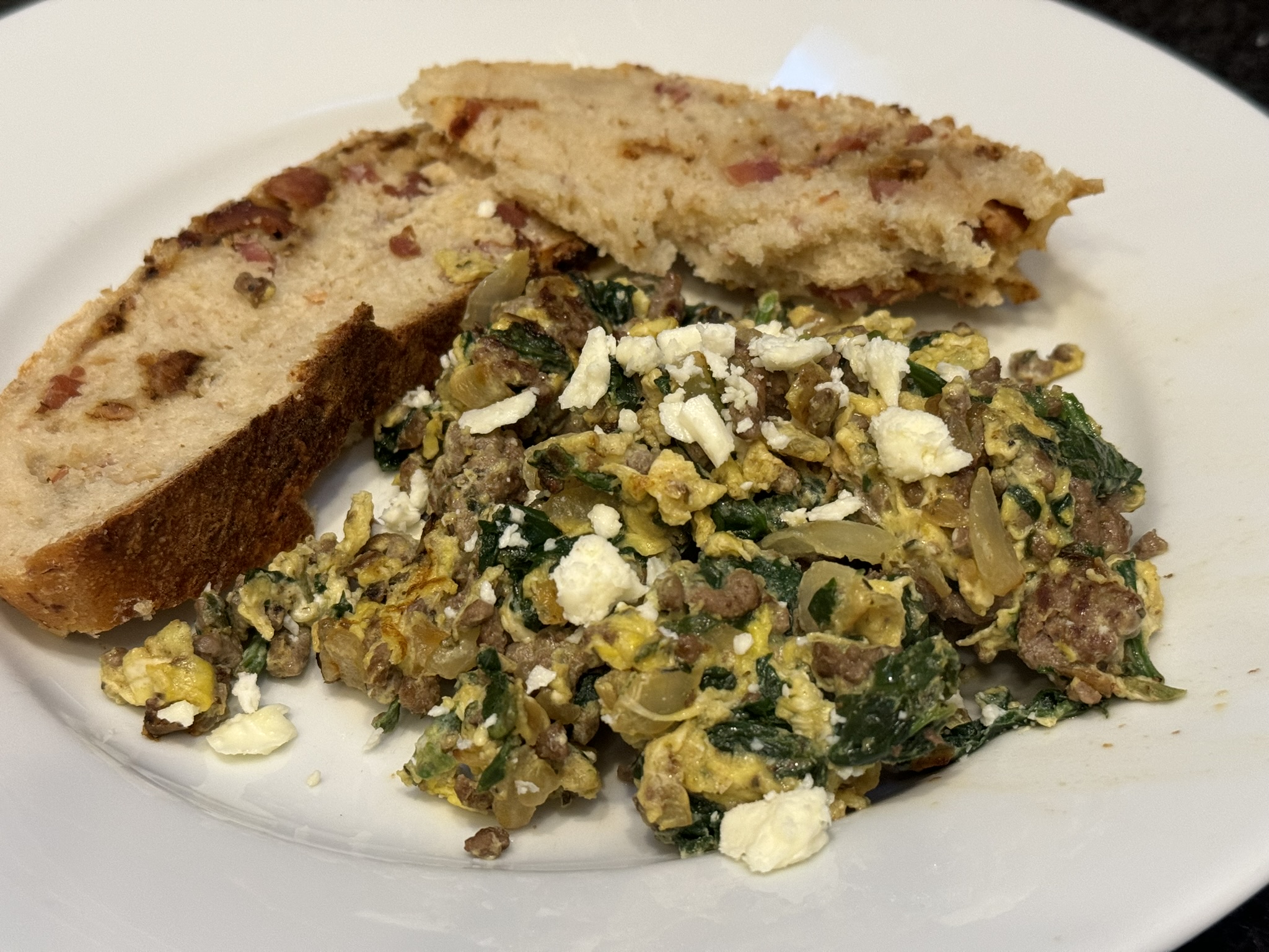 After a long road trip, my husband, James T. and I rolled in late and I found myself whipping up a quick meal with just half a pound of ground beef. This recipe, a spin on Joe’s Special from a popular 1920s San Fransico diner, is my go-to. It’s easy, versatile, and budget-friendly. Just mix the beef with spinach and eggs for a hearty breakfast hash. Originally a breakfast dish, it’s perfect any time of day. If you’re not watching your carbs, it pairs deliciously with my homemade Bacon No Knead Bread. It’s low-carb and high-protein, and it’s a satisfying meal that really hits the spot. (Bacon No Knead Bread recipe and video coming soon!)