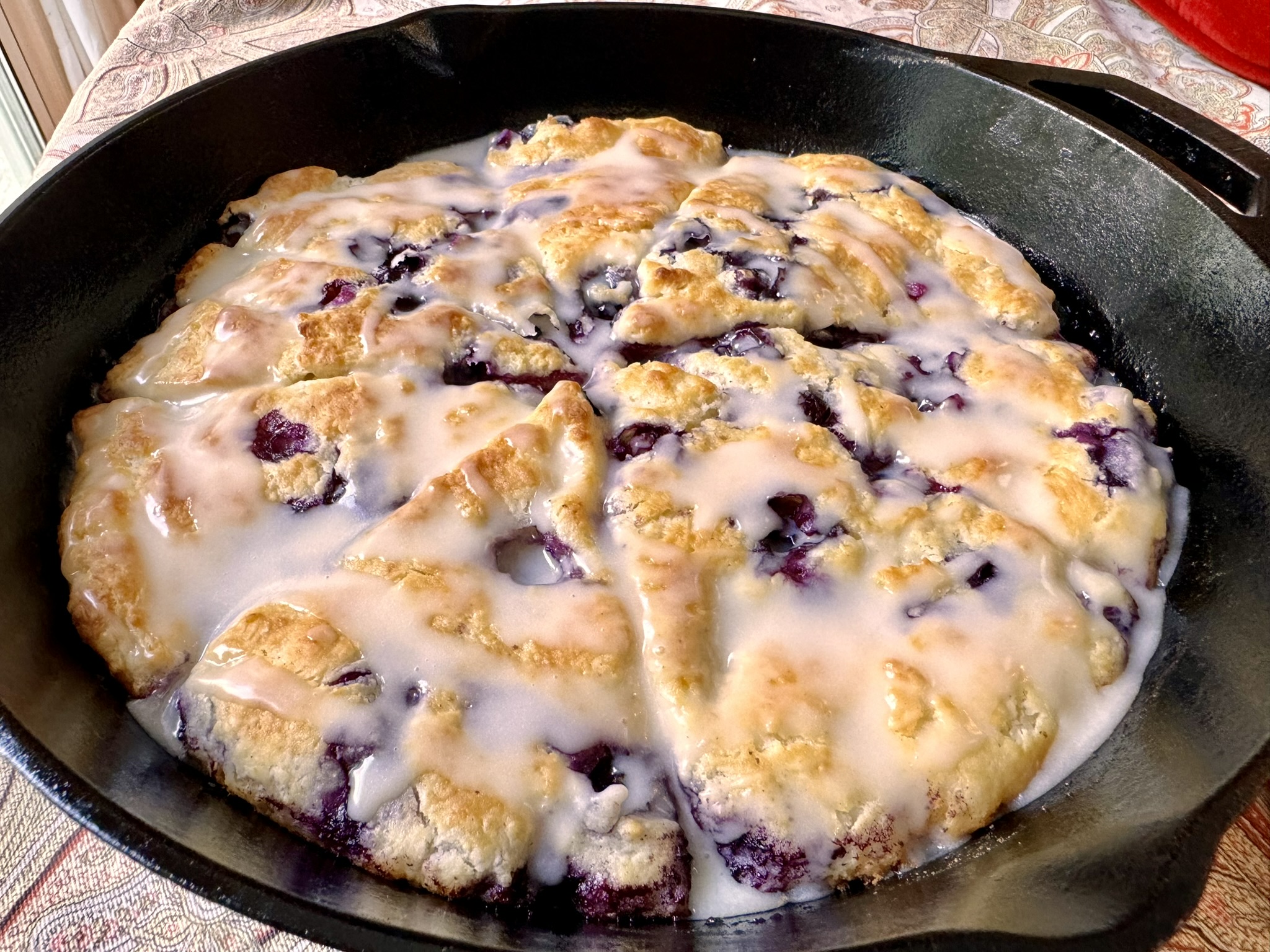 - Bake the biscuits at 500 degrees Fahrenheit for approximately 12 to 15 minutes. Around the 8-minute mark, remove the skillet from the oven. Brush the biscuits generously with melted salted butter, ensuring to coat the tops and sides evenly. As the tops begin to lightly brown and the blueberries burst, indicating doneness, remove the biscuits from the oven.Remember, the middle of the biscuits will retain high temperatures once removed from the oven, continuing the cooking process, so it's crucial not to overbake them.