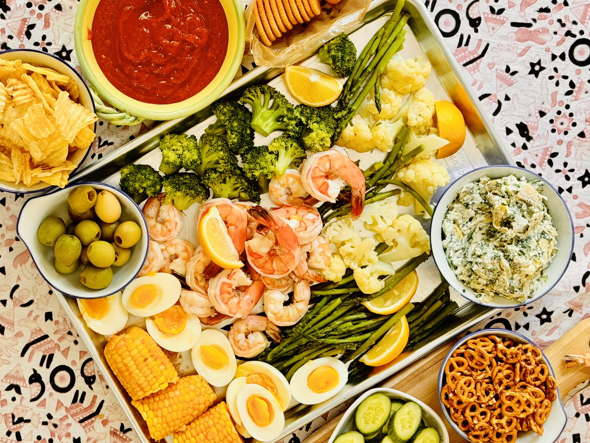 - Drain everything and arrange it beautifully on a sheet pan or large serving tray.