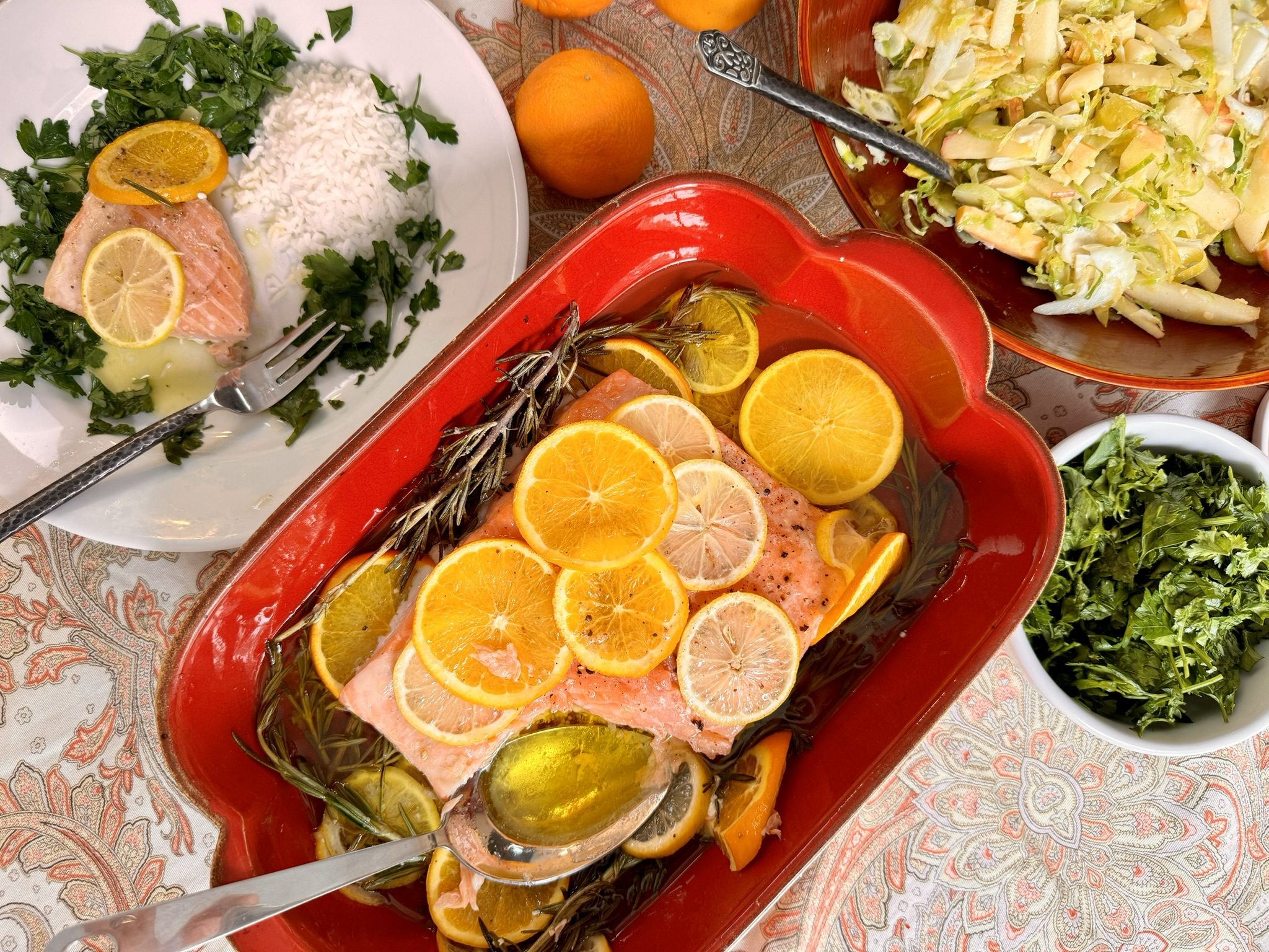 - Season the salmon with kosher salt and pepper on both sides and place it in a large baking dish (a rimmed baking sheet will also work in a pinch, although the salmon will not quite be submerged) with the sliced lemons, oranges, and herb sprigs, if using.