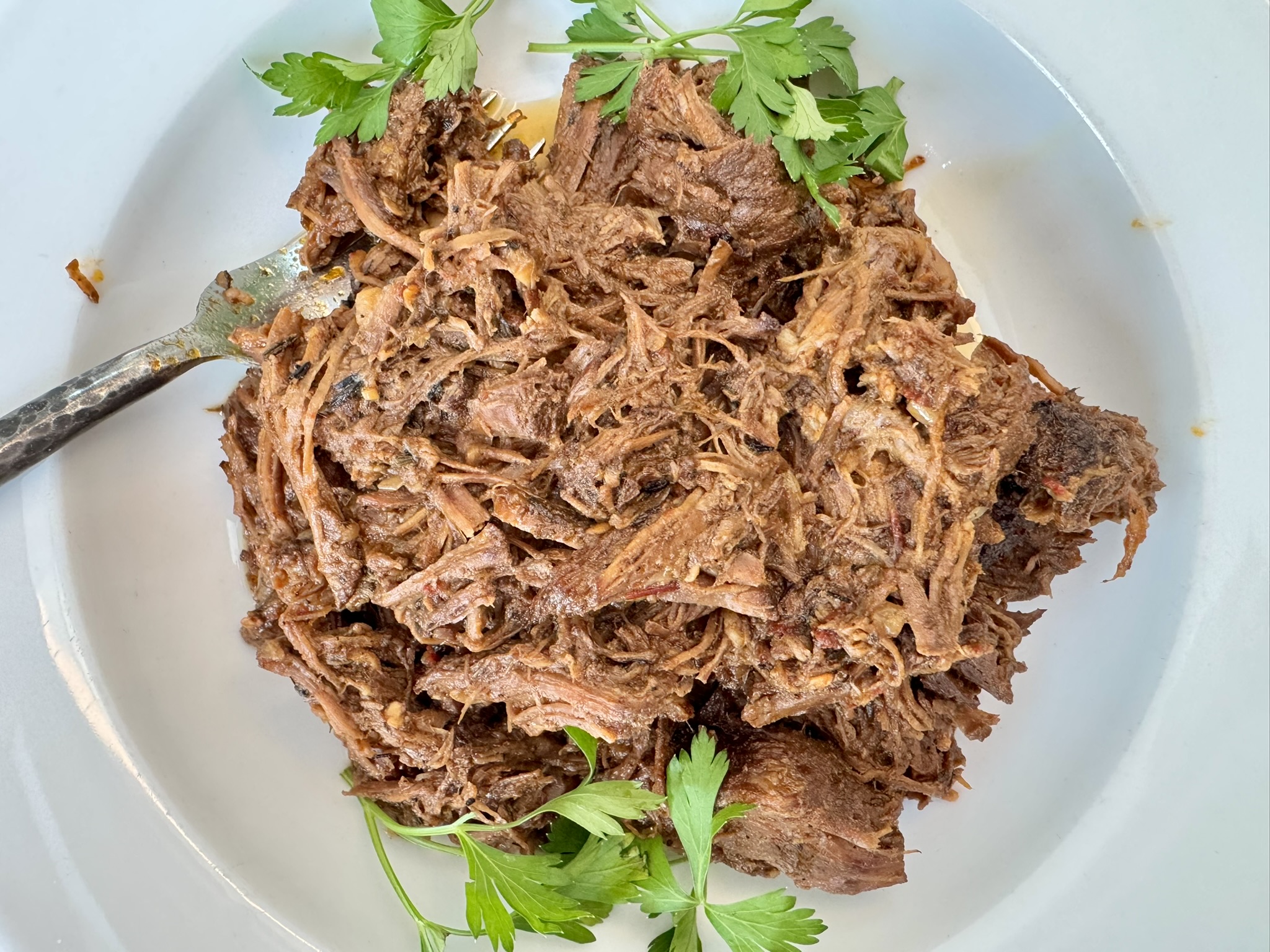 Spoon that luscious mash onto a platter, top with shredded beef, drizzle with the sauce, sprinkle with cilantro or parsley, and enjoy!