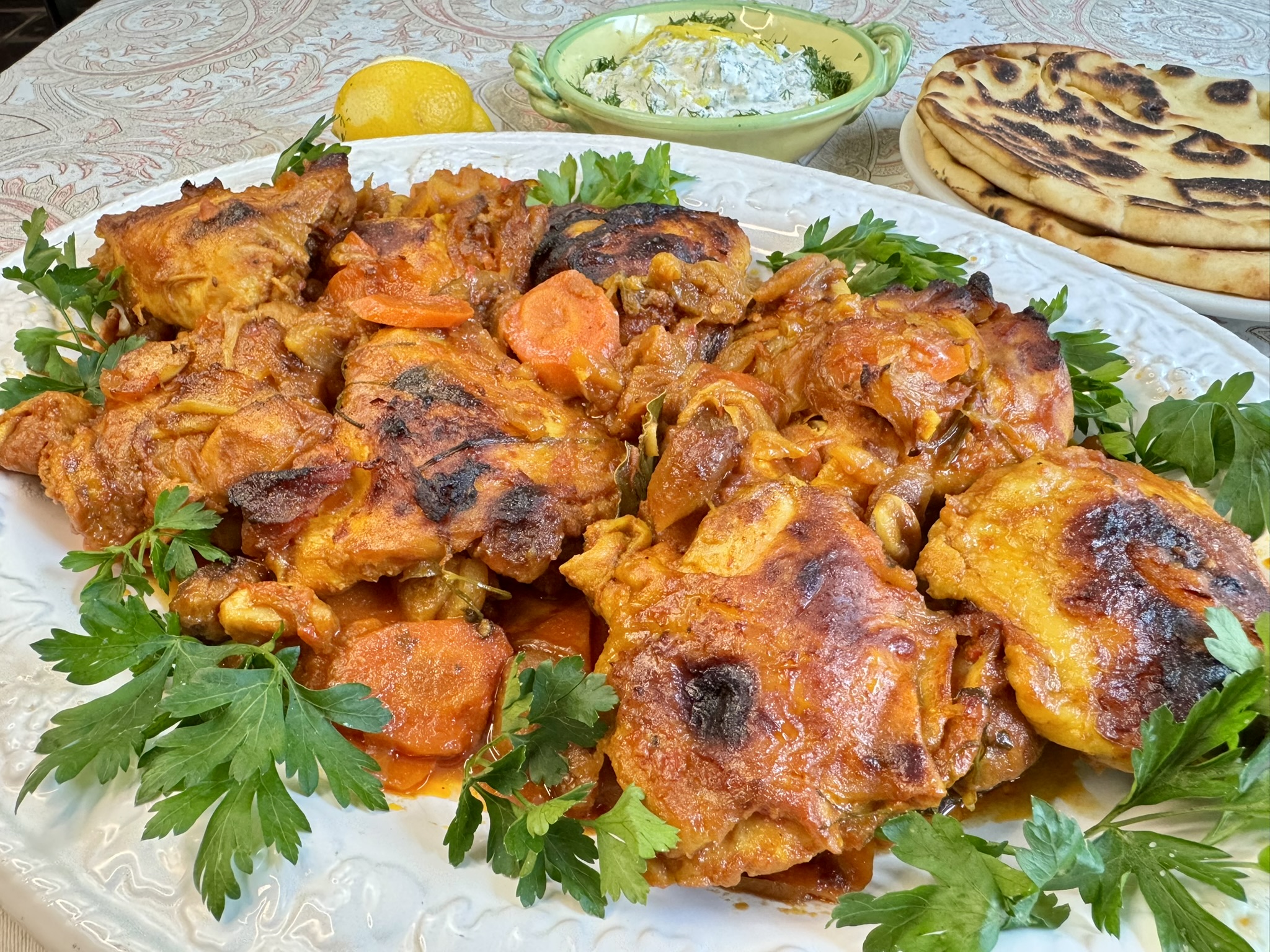 ✨ It’s a Tunisian‑style chicken dinner, marinated overnight in Tabil spices and mild harissa, then braised in a roasting pan with carrots, onions, garlic, tomatoes, and sweet apricots. Tender, smoky‑sweet, and effortless — a dish that disappears fast.