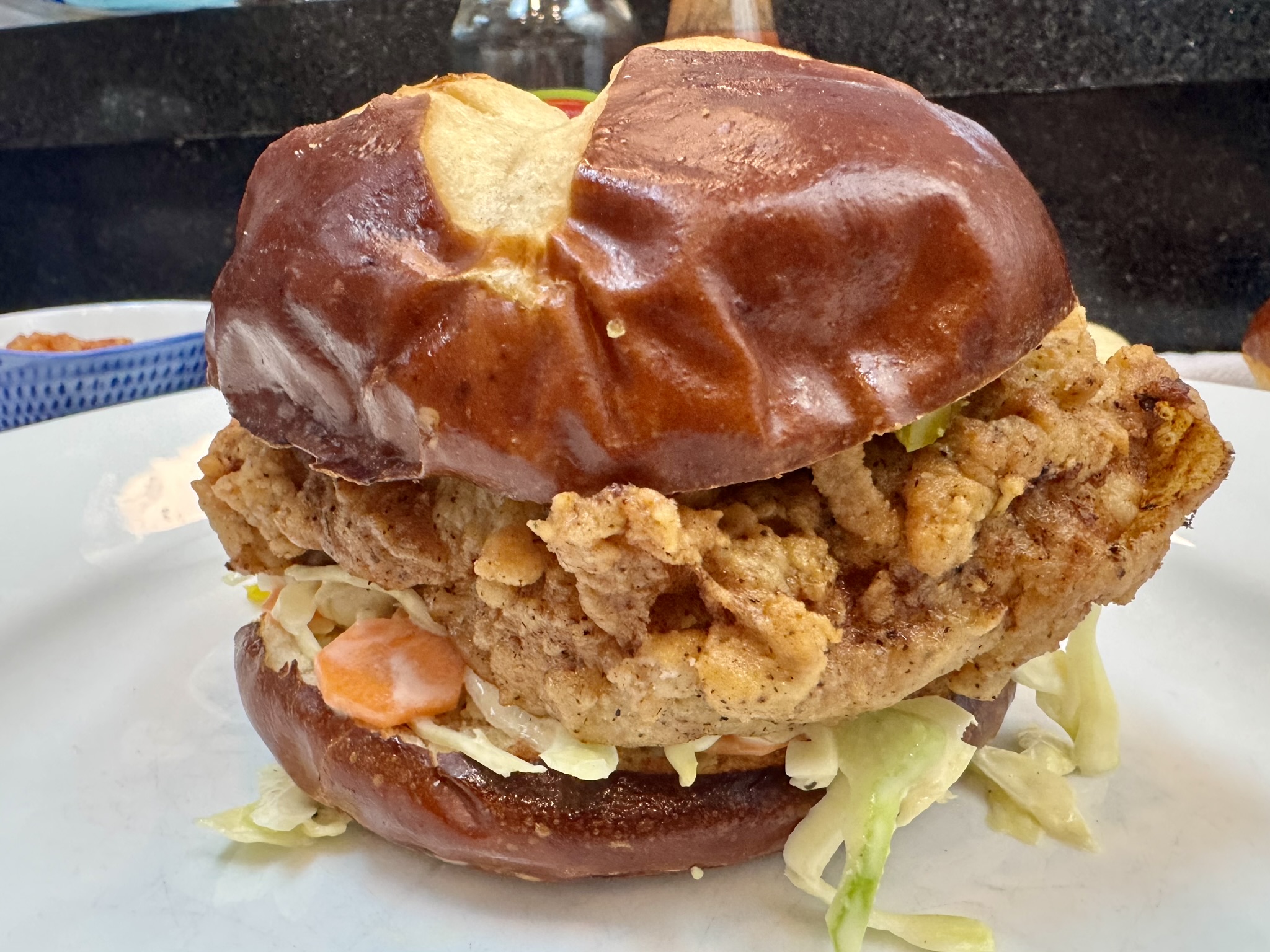 - Pretzel bun + extra pickles (or jalapenos) with slaw